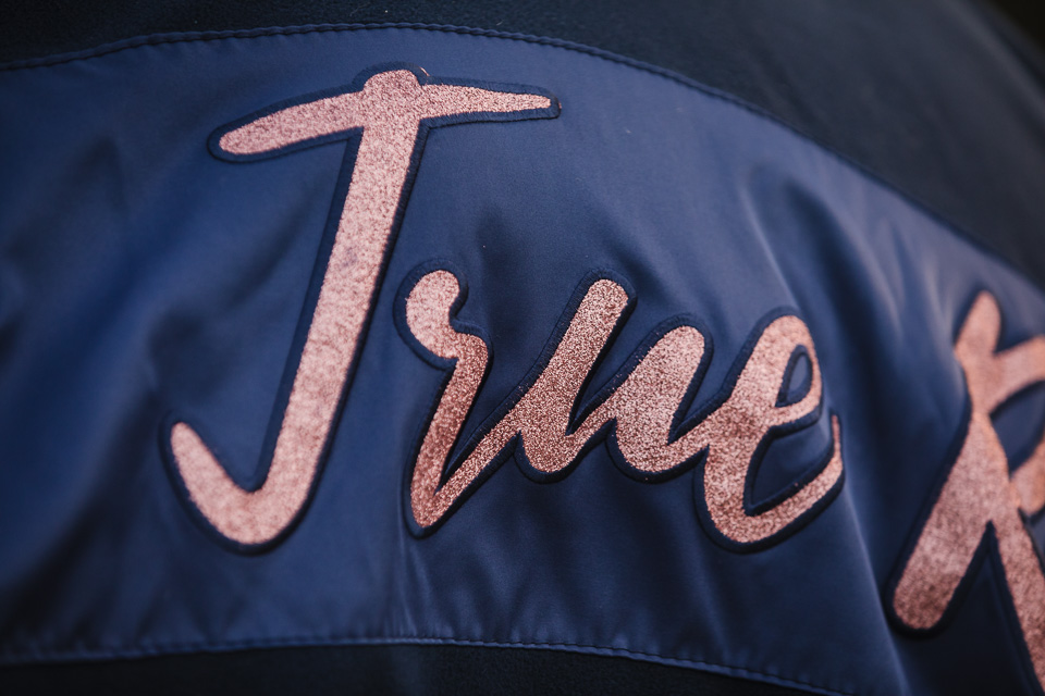 - Der goldglitzernde True Rider-Schriftzug auf dem Satinstreifen auf der linken Seite sorgt für Glanz und Eleganz