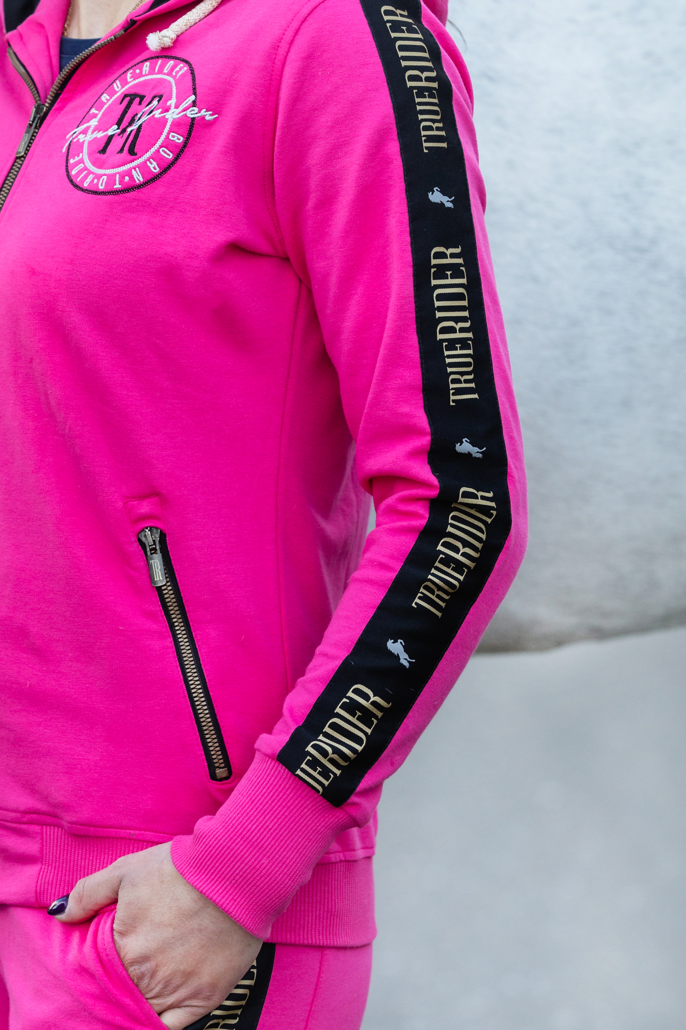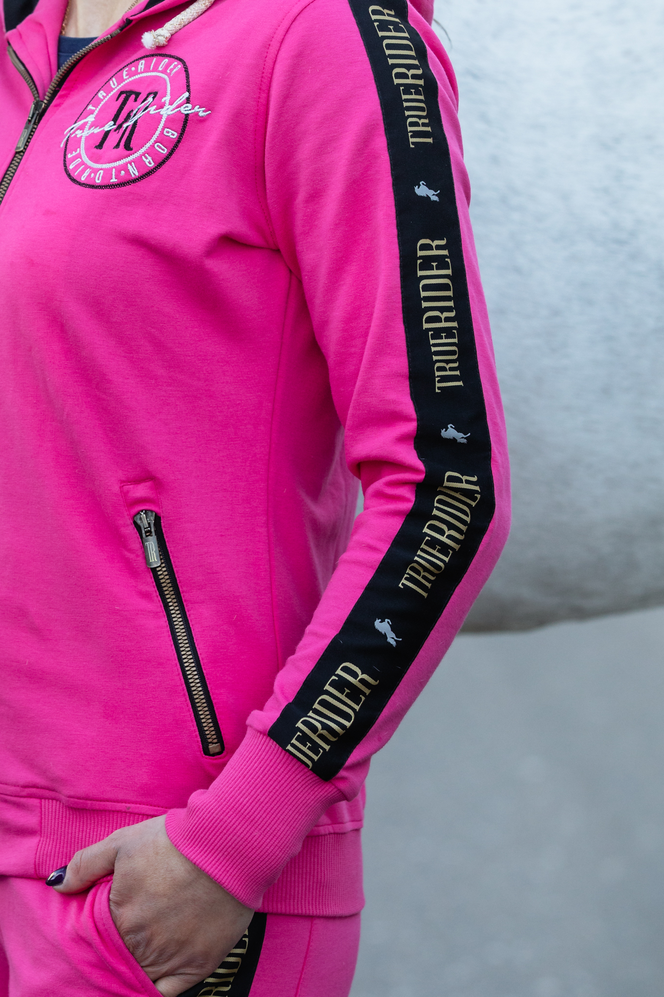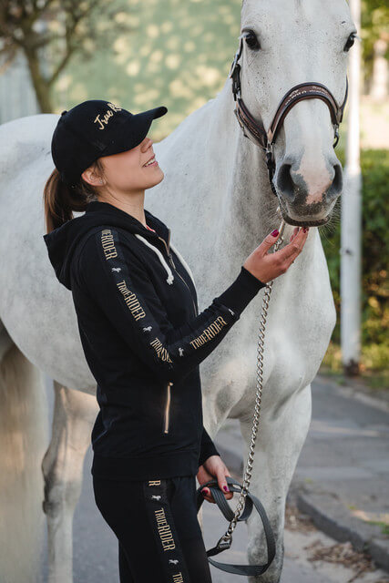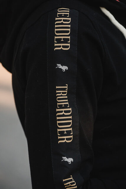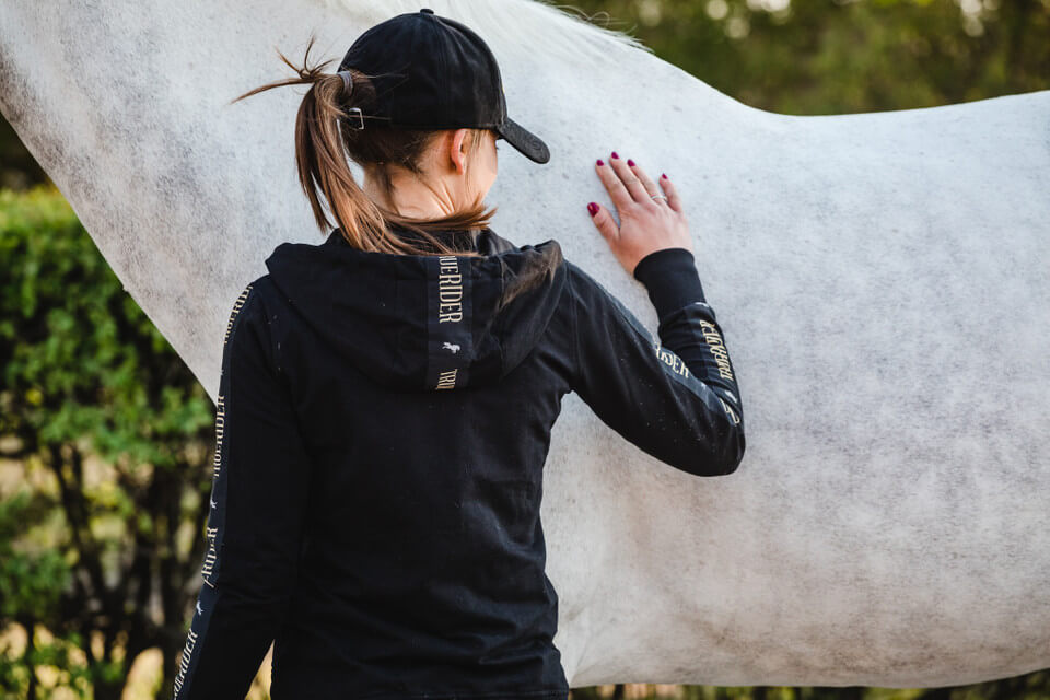 A wide stripe on the shoulders and the hood gives a completely new character to the sweatshirt, which from an ordinary equestrian sweatshirt becomes a more elegant accessory in the stable and on a daily basis.