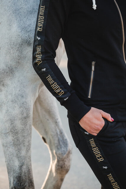 Perfect for anyone who likes his outfit to be a harmonious whole. Choosing black colour you can create whole sets by adding other items from our Black & Gold collection: sweatpants, summer leggings, technical T-shirt, vest, cap with a visor, saddle pad and fly veils.