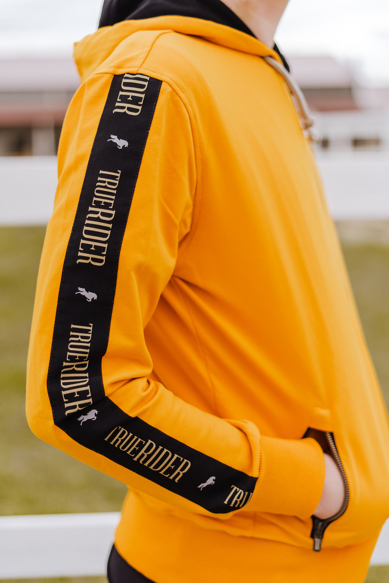 A wide stripe on the shoulders and the hood gives a completely new character to the sweatshirt, which from an ordinary equestrian sweatshirt becomes a more elegant accessory in the stable and on a daily basis.